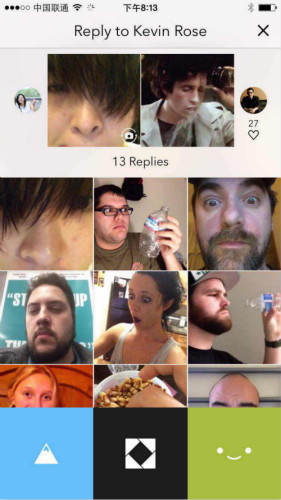 回复功能意味道着什么,意味着视频也能盖楼,下图是某逗逼(创始人Kevin Rose)喝水故意往脸上泼水的“作品”,下面一个矩阵的人都在模仿: