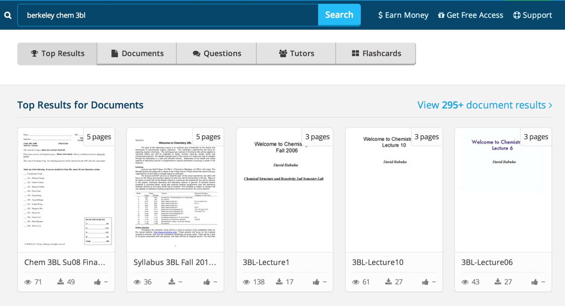 学生提供的所有资料都会进行检查和分类,同质化的资料将会被拒绝。平台上将每个材料按照学校,专业,教师等因素被一一归类,更加精准地定位了每个学生的需求。学生通过搜索查找,可以快捷对应课程,甚至于哪一个教授考试癖好,对于提高分数显然是非常有利的。例如你在搜berkeley chem 3bl这门课,你就可以看到许多学生们上传的学习资料,而且他们的优质程度也由用户通过点赞的方式来筛选。另外,Course Hero还推出了学习资料的package,提供整理过的资料包。将用户体验做到更好,也是Course Hero成功的另一个原因。