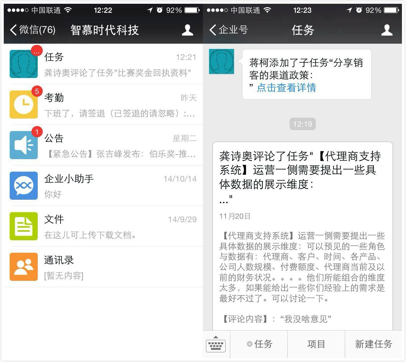 随新版本上线,推事本也打通了微信企业号。用户可以在企业号当中访问和创建大部分功能。根据推事本 CTO 李弦的描述,虽然推事本这类新兴协作工具的交互和逻辑能够被一线员工接受,但企业服务的支付主体仍是公司和采购,微信整合能够在独立应用之外服务这些在认知和使用习惯上相对保守的群体,让推事本可以实现从上至下的协作和管理而不出现断层。