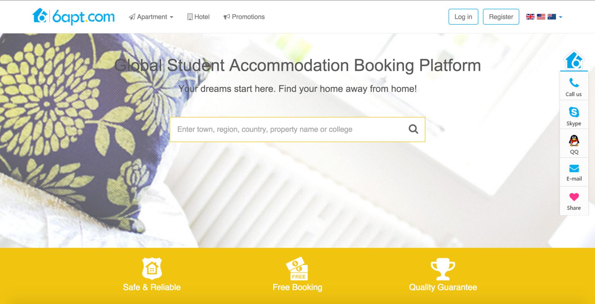 6apt是一个为出国留学生提供留学所在地的房源信息平台,目前在平台上主要以学校周边的学生公寓为主,少数的私人房源。留学生可以通过搜索引擎,按照国家,地域,学校以及交通便利程度来筛选钟意的房源。目前,6apt覆盖了四个英语留学国家,包括英国,法国,美国和澳大利亚。