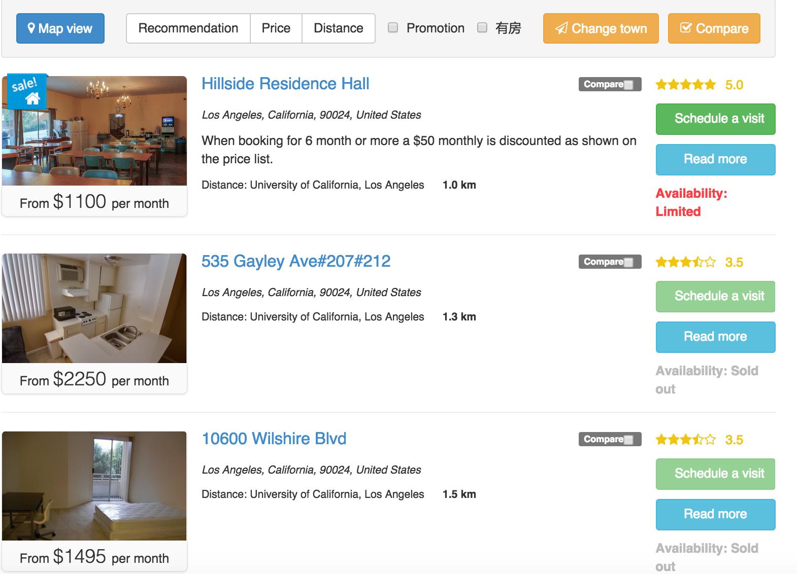 例如你拿到了UCLA的offer,你可以以UCLA作为关键字进行搜索,之后系统反馈给你一个list,上面有房屋信息,地址,价钱,距离,是否有折扣,房源情况。你还可以根据你个人的偏好,例如你对房子的交通有很高的要求,希望租一个距离较近的房子,那么你则可以按照距离进行搜索排序,还可以在对比几个比较中意的房源,最后决定自己的租房。