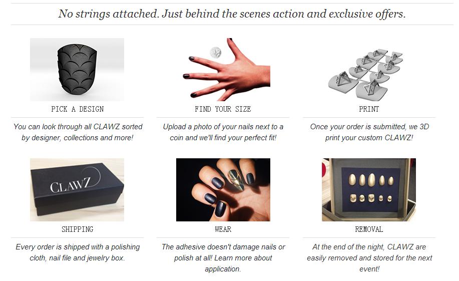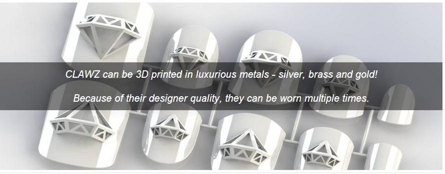 Clawz 希望运用3D打印技术制作甲片:在贵金属上进行打印,例如金、银以及黄铜等。用户首先可选择一个喜爱的设计,然后线上提交自己的手部照片,Clawz会根据你的信息制作3D甲片,完成后寄给你。3D甲片可多次佩戴和卸除,同时不会对指甲造成伤害。不过Clawz是否能制作出完全贴合个人不同指甲大小的甲片是我的一个疑问。