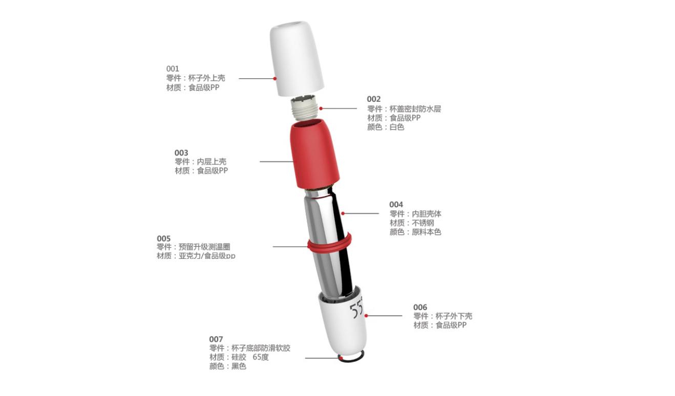 在55°杯食品级不锈钢夹层中,贮存了一种微米级传热材质,它会随着温度的变化发生可逆的固液转换。当水温高于55度时能够快速把热量传导到杯壁并存储起来,使水温降到55度左右。当水温低于55度时,该材质会慢慢的释放热量。