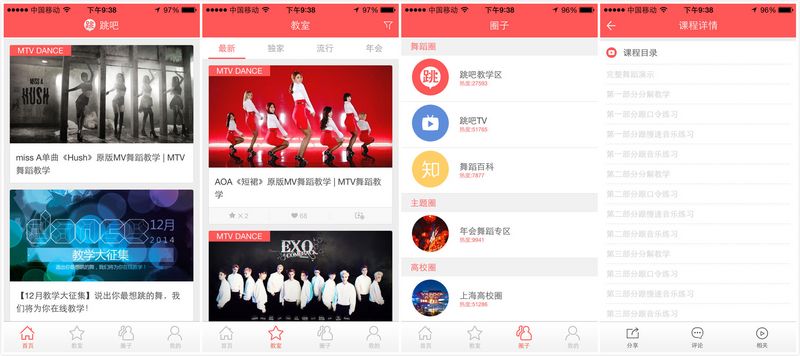 所以,跳吧的初始形态是一个重内容的教学工具,里面有三分之一团队自己拍摄的专业教学视频,以及三分之二与Studio合作的教学视频,针对目前大热的明星舞蹈进行拆解授课。优势在于早期积累了大量版权视频,舞蹈发烧友和达人进驻到应用里。