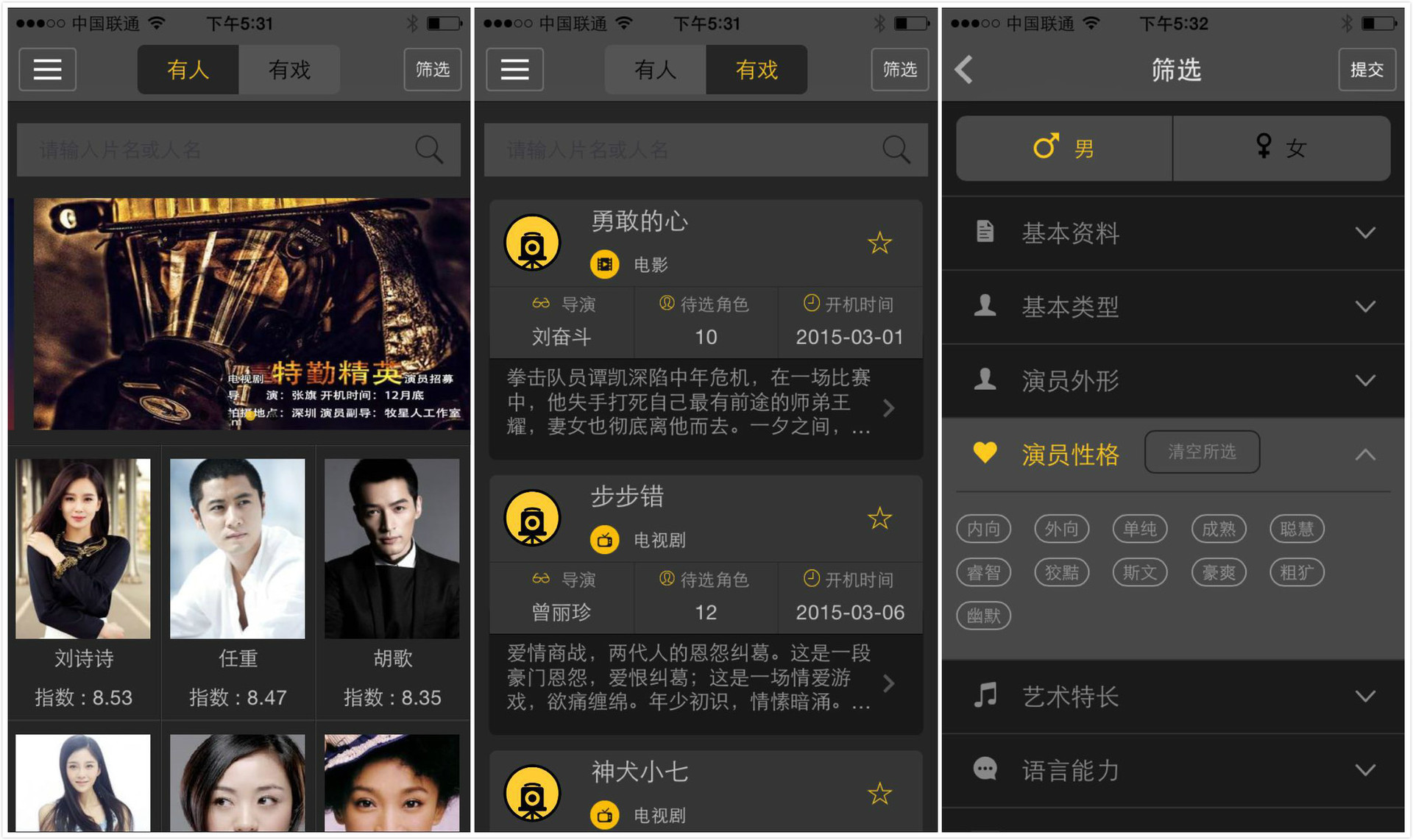 目前“有人有戏”只是适合于初步海选,演员的履历、作品链接也不周全,平台现在尚未针对剧组开放,现在上面陈列的影视剧作品都是牧星人自己投资或运营的项目,最新版产品也还在开发之中。当然这平台不太适合找一线大明星,对找演员这方需求来看,它只是方便初步海选,然后再从中择优,以后“有人有戏”希望能把试镜这一步也在线上完成,进一步提升效率。