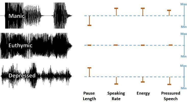 人们说话声音里隐藏着许多有价值的情绪信息。一个悲伤的人可能说话声音比较沙哑、字句停顿时间长、讲话速度慢、语调单一。当一个人狂躁的时候,说话的声音大、语速快、压迫感强。密歇根大学的精神病学家Melvin McInnis和计算机专家Emily Mower Provost、Zahi Karam同时正在进行一个叫做PRIORI的项目,通过分析语音波形里的音调、音量和节奏等特征,在情绪真正开始波动之前,预测情绪的变化。这个项目于2013年开始成立,目前还属于发展阶段。
