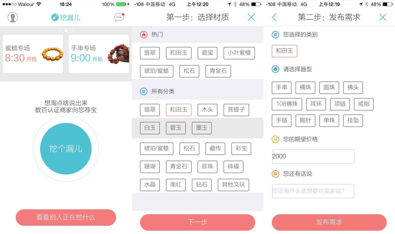 用户注册挖漏儿后,不会看到任何商品信息(除了闪购),只能发布自己的需求,基本上主要有两点就可以:要什么、接受什么价位——这或多或少有点门槛,用户至少需要了解一下所买珠宝的大概行情。随后,系统会将用户的需求推送给相关商家,比如你要的是1000元的翡翠,那么就会推送给有翡翠的商家。