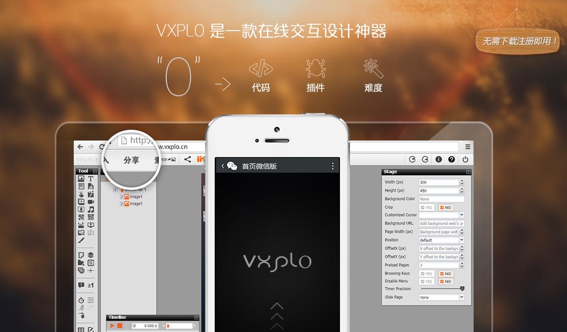 VXPLO互动大师是一款交互设计和编辑神器,通过在自建引擎上加一层壳,使用户在不需下载软件,不用编写代码的情况下完成交互设计。设计的产品可以是H5页面广告、视频+广告、网页小游戏互动视频等等。