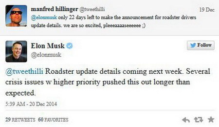 今年10月10号,百公里加速3.2秒的Model S P85D 推出后热度一直不减,特斯拉于2008 年到 2011 年之间生产的第一批电动跑车Roadster 已许久不被人提起,不过,近期Twitter上一位Roadster 车主又让它重回人们视线。该车主发帖表示自己很期待即将公布的Roadster 升级细节,Elon Musk对他做出了回应,表示将在本周会公布升级信息,并且给出了一系列导致细节发布推迟的原因(“crisis issues”),也就是前段时间的SpaceX“猎鹰9”火箭爆炸事件。