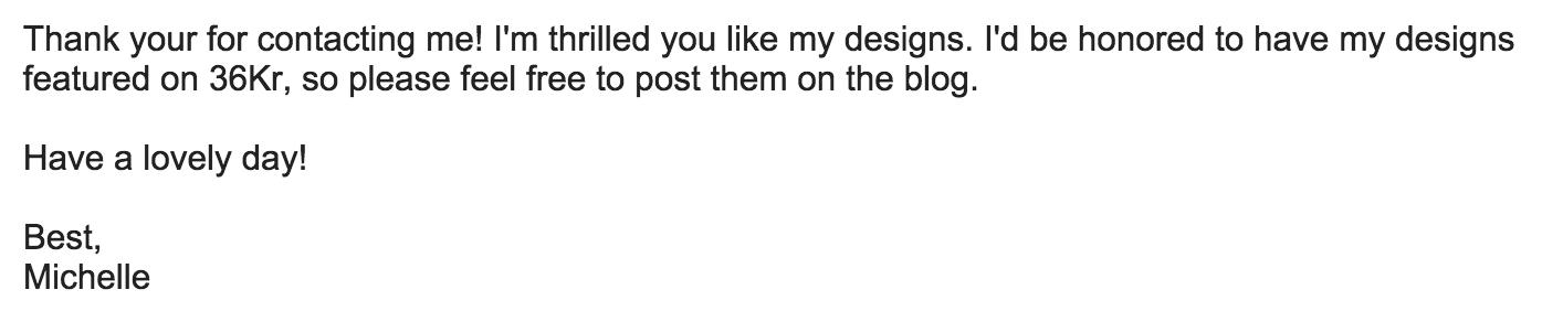 36氪联系到她本人,已得到她在本站刊登作品的准许。看回复,真是个明朗的妹子呢。