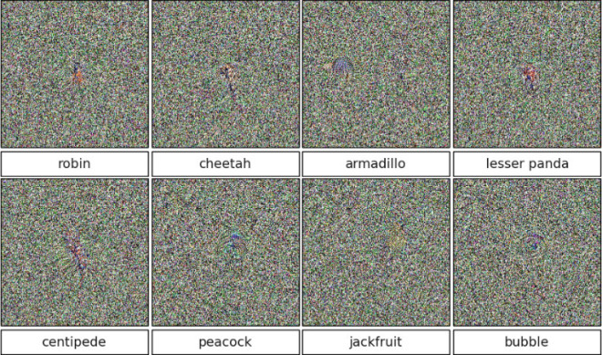 但是,研究人员还发现AI通常还会被纯静态的图像愚弄。采用一种略微不同的进化技术之后,研究人员生成了另一组图像(下图)。这些图像在人眼看来几乎都是一样的,就像是一台坏掉的电视上的图像。但是在最先进的神经网络眼里,这些却是蜈蚣(centipede)、猎豹(cheetah)、孔雀(peacock)等等。