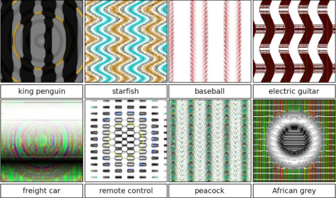 为此,研究人员利用进化算法生成随机图像作为视觉诱饵。他们首先利用程序生成一幅图像,然后对图像进行略微的改变。接着把原图和略微修改后的图一并提交给基于ImageNet训练的神经网络。如果修改过的图被AI认为比原图更接近某个对象,研究人员就保留修改过的图,然后重复此过程。否则的话就回退重试。这样下来的结果就是最好看者生存—或者说,是计算机最能识别的的图像存活了下来(而非最合适者—原图)。
