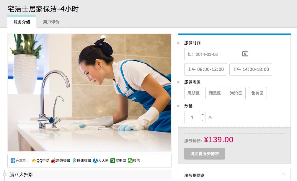 他们具体是怎么做的呢?在“好慷在线”网站上可以看到,他们只定义了“宅洁士居家保洁”这一款四个小时、139元的保洁产品,预订的用户只可选择在每天上午8点到中午12点,或者是下午两点至六点让阿姨上门服务。也就是说,好慷让阿姨们的上班时间固定了,她们每天只需要上下午分别服务两家用户即可,甚至周日还可以有自己的休息日,就像白领一样有了“朝九晚五”的工作节奏,随之而来的,则是好慷作为平台可以对自家保洁产品进行标准化的库存管理。