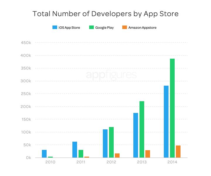 应用数据追踪公司AppFigures的最新统计显示,Google Play Store 2014年的应用和开发者数量首次双双超过苹果App Store。Play Store的Android应用总量达到143万款,而App Store的iOS应用总量为121万款。数据表明,Google开发者社区的规模连续第三年超过苹果。2014年,Play Store的开发者总数为38.8万,App Store开发者总数约为28.2万。