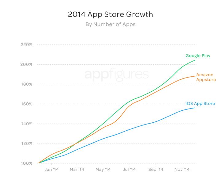 而从应用数量的增幅来看,Google Play Store、苹果App Store和Amazon Appstore三大应用商店都在2014年实现了至少50%的增长。其中Google Play增幅最大,且大部分增长发生在2014年的下半年。而亚马逊尽管在2014年增长了90%,应用数量仍然只有29.3万款。