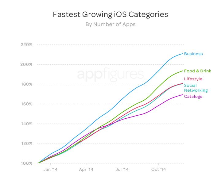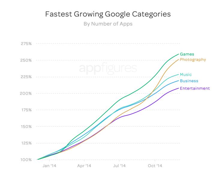 AppFigures指出,两大应用商店在增长最快的领域方面有所差异。Google Play中,出现增长的前五类应用为游戏、摄影、音乐、商业和娱乐。而在App Store中,位列前五的是商业、食品/饮料、生活、社交和目录。