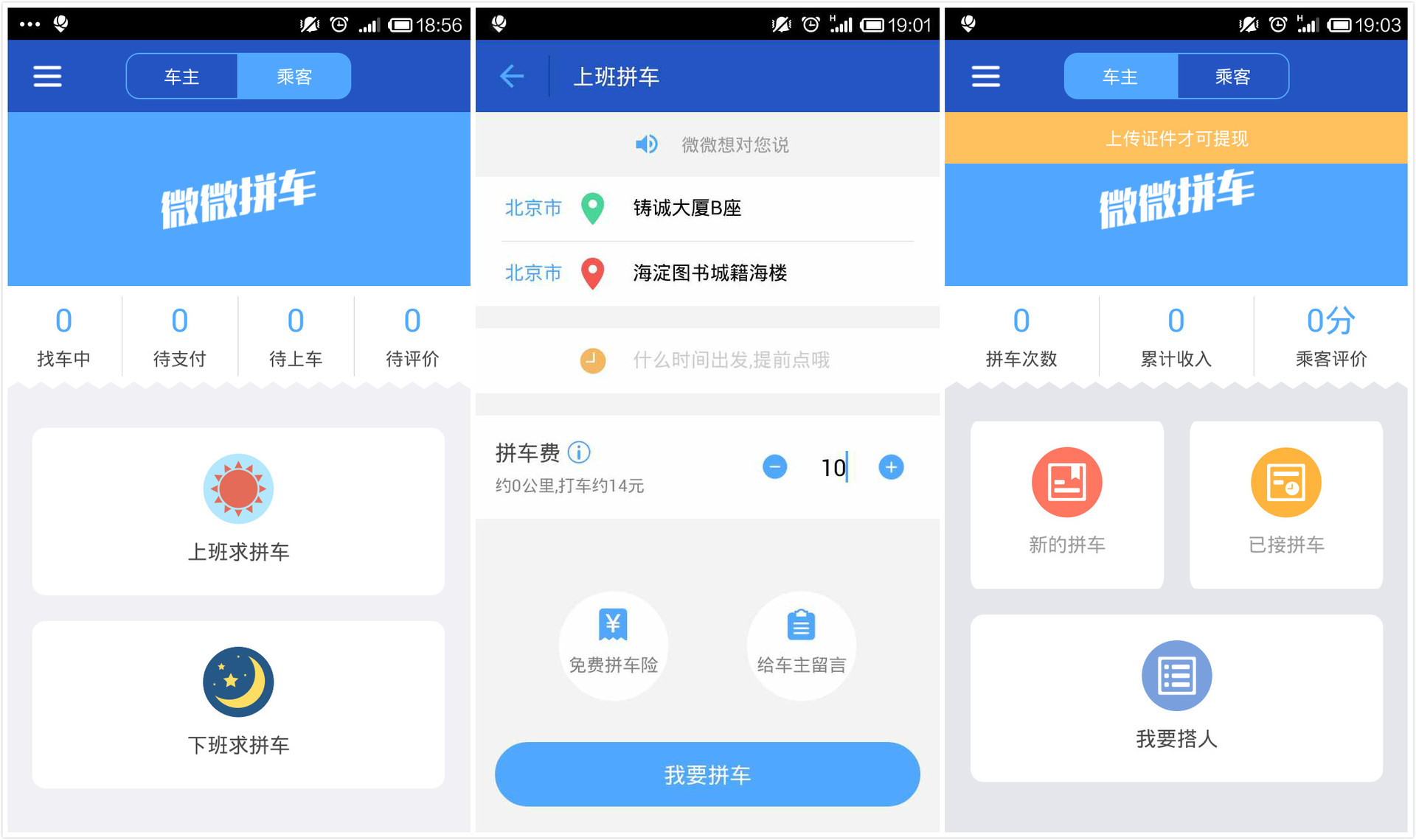 微微拼车成立于2014年4月,简单来说,这个产品是希望私家车车主可以把自己上下班时间段的运载余力共享出来,让顺路的乘客顺道搭乘。一来私家车车主可以以多认识几个朋友、能够和人闲聊的心态去帮助需要用车的上班族,二来乘客也可以以比出租车更低的价格用上车。