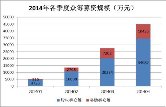从2014年众筹平台募资规模来看,国内众筹平台融资规模增速较快,且股权众筹平台的融资规模明显高于奖励类众筹平台。数据显示,2014年第一季度国内众筹募资总金额为5245万元,股权众筹募资4725万元,奖励众筹募资仅520万元。到第四季度,我国众筹募资总金额累计突破4.5亿元,其中包括奖励众筹10435万元,股权众筹34682万元。