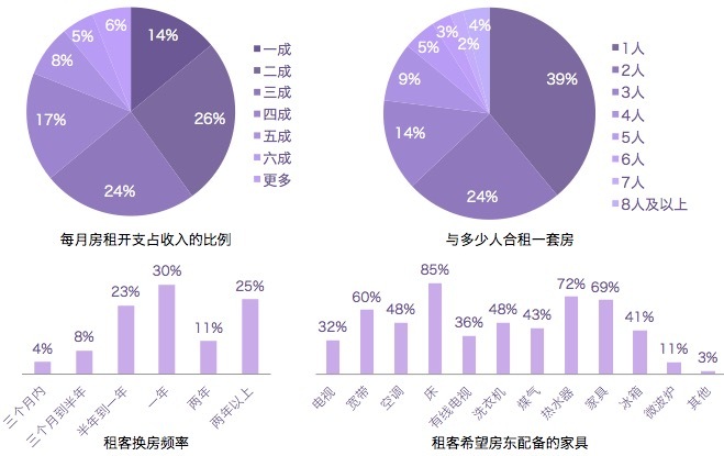 租客方面,赶集网发布的《2013年租房市场报告》中显示:58%的人选择整租,42%选择合租。在所有租客中42%为20~24岁,35%人为25~29岁,12%人30~34岁,8%人35岁以上,3%人19岁以下。