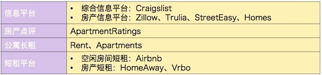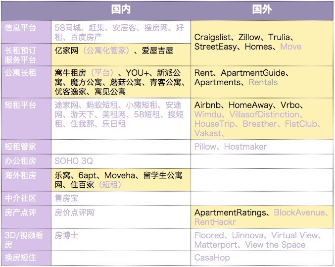 国内外长租相关的网站不完全统计有以下几类,后文将主要分析图中黑色字体的网站模式及运营情况。