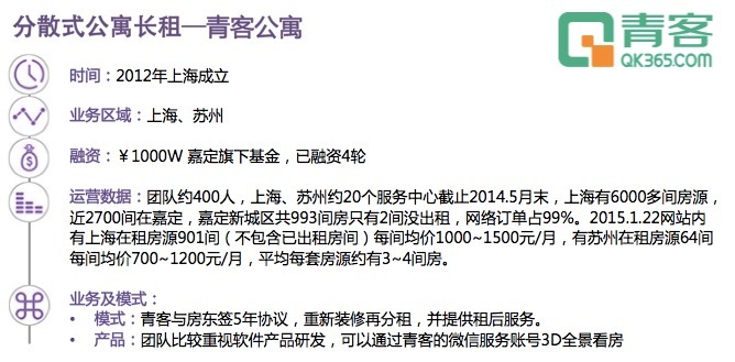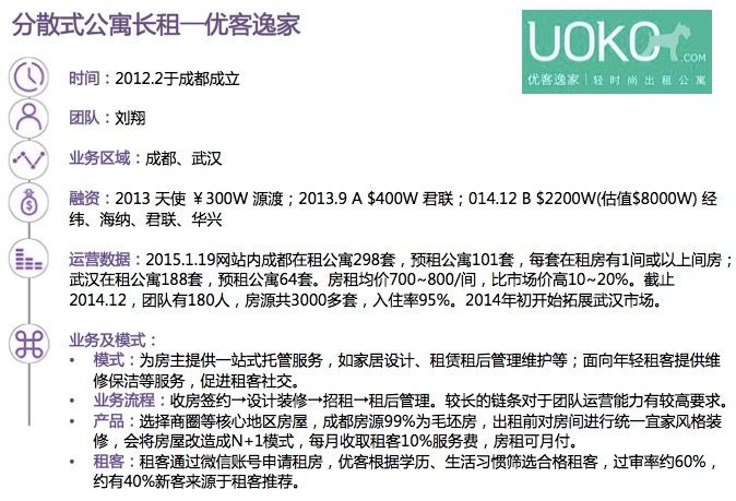 2002年成立,主营业务为公寓出租及租后家政等服务。2011年开始布局线上自建在线租房网站并与去哪儿艺龙等合作,2014年开始与企业合作,提供商旅住宿服务,截止2014年,11月在北京、上海两地实现市场化房屋租赁服务3W套、公租房代理经租2W套的业务规模,资产管理规模1000亿元。