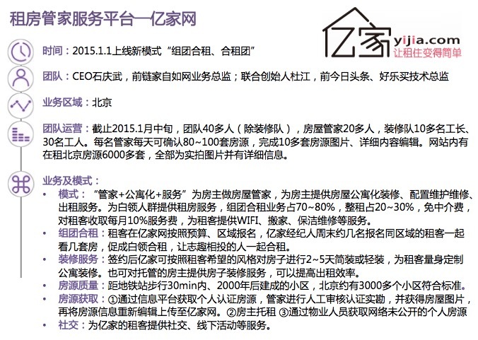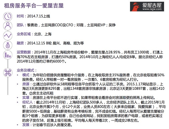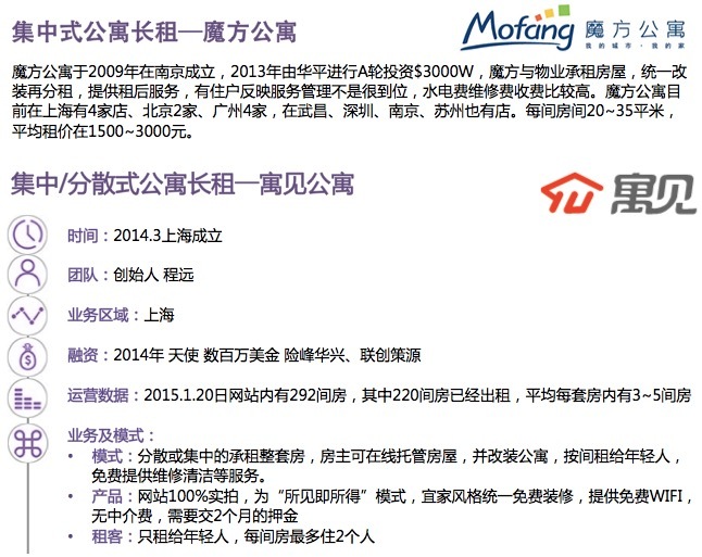 链家旗下品牌,2011年北京成立,截止2014年末,自如在京约有2.5~2.6W套房,约10W间房,房间平均每间比普通房源贵300元/月。在2~4月出租率约90~95%,11~2月出租率约60~70%,租客违约率约30%。链家在京约2W名经纪人,开拓房源比较容易,自如2014.10开始开拓上海业务,截止2014.12月末约有20套房源。