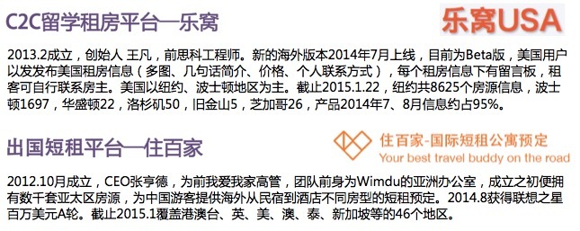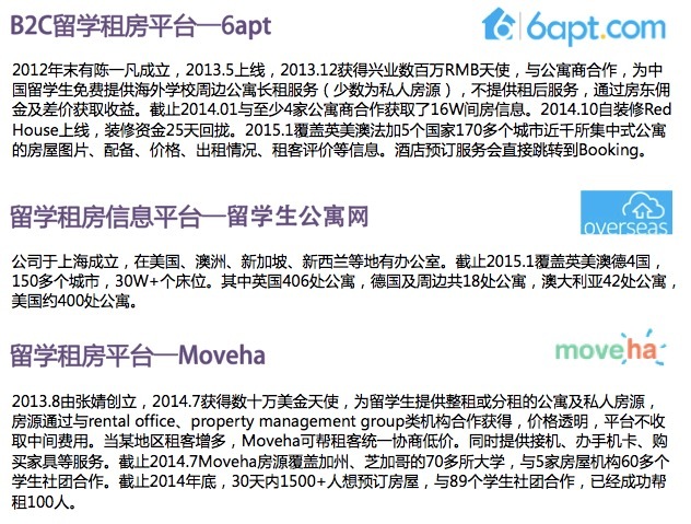 海外租房网站Craigslist、Zillow、Airbnb等已经处于成熟的运营状态中,一些国内团队专门为留学生、出国人士提供海外公寓长租、短租服务,可将租金降低30~50%,同样找到了新的机会。