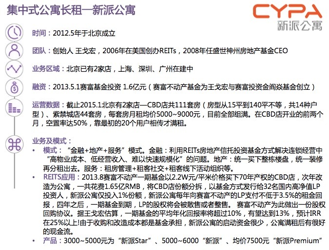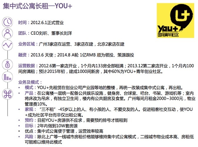 集中式公寓:如YOU+、新派公寓等,集中式公寓获取房源难度较大,装修到开业周期约3个月,公寓的品质配套设施情况较好,未来也有向创业孵化器方法发展的可能;
