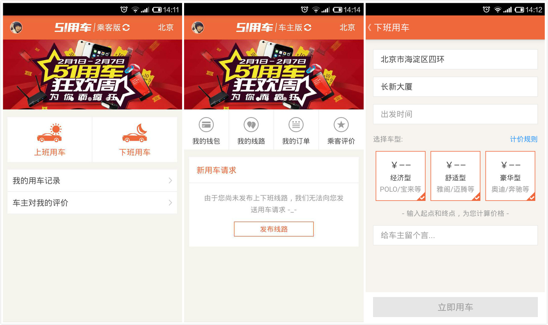 而一对一的“51用车”,则更为标准化,只需要匹配点对点的车主和用户即可。它的模式和我们之前报道的天天用车类似,一位车主只能搭载一位乘客(为了更标准也为了便于二人搭建社交氛围)当乘客叫车时,他输入起点地理位置以及终点的地理位置之后,系统会自动计算出这段距离需要的价格(51用车提供三种车型,经济型、舒适性、豪华型的车价格不等,但基本低于的士价格,尤其在远距离运输时),让用户在叫车时即预先将费用结清,这种平台制定乘车价格的策略也是一种提高效率的手段。