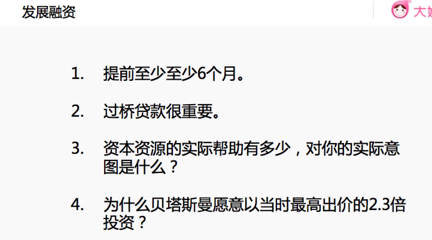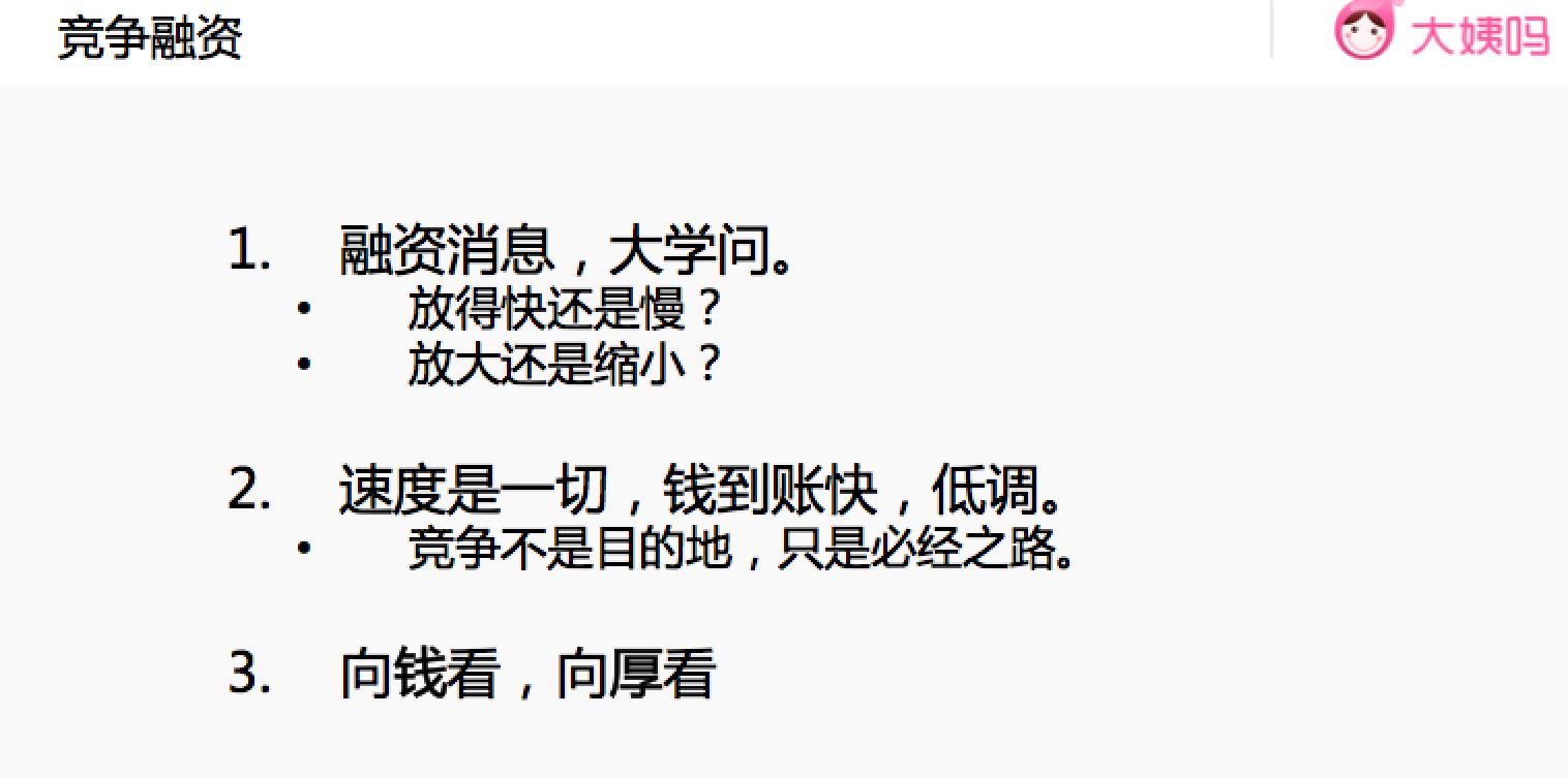 面对竞争,到帐速度就是一切。这一轮大姨吗的钱只用了45天到帐,主要是因为提前准备好了各项资料,包括用户数据、审计报告等,供投资方尽快完成审查,为自己争取时间。