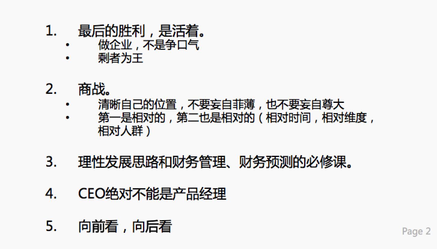 对于CEO来说,理清发展思路和财务管理、财务预测是CEO的必修课。而CEO绝对不能是产品经理,他要花时间和人打交道,战略管理、团队建设等才是管理,否则就只能是“创始人”。