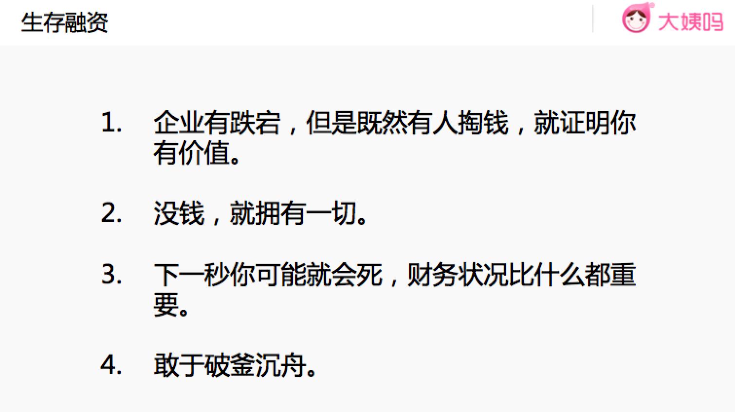 市场形势瞬息万变,也许下一秒你就会死掉,创业者不仅要时时关注公司的财务状况,更要有破釜沉舟的勇气。2012年7月份,大姨吗拿到真格基金150万元融资,但此时竞争对手拿到了5000万美元融资。原本大姨吗打算花24个月花完这笔钱,但他们当机立断,决定用4个月花掉,开始谈下一轮融资。