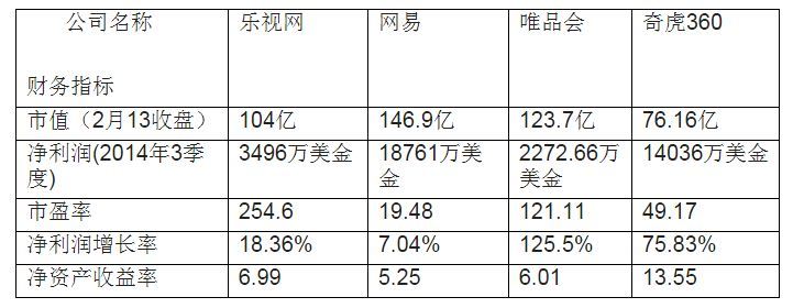 选取与乐视网市值相近的三家互联网公司进行分析,即网易和唯品会,以及刚被乐视超越不久的360,采用2月14日的外汇牌价6.2399进行换算,其主要财务指标如下表所示: