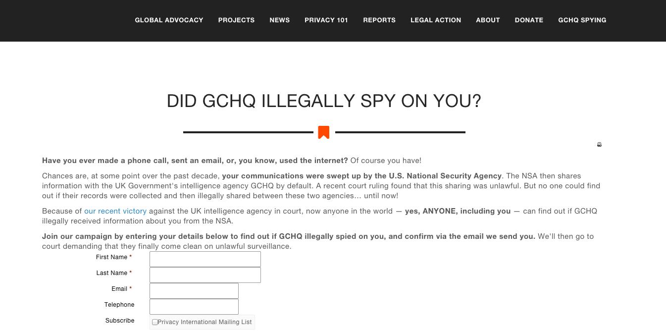 如今,应广大用户需求,Privacy International上线了一个在线普查表格,用户可以直接在上面提交信息,查询“我是否曾被GCHQ监视”?OMG是不是很刺激?这个服务面对英国公民和非公民。