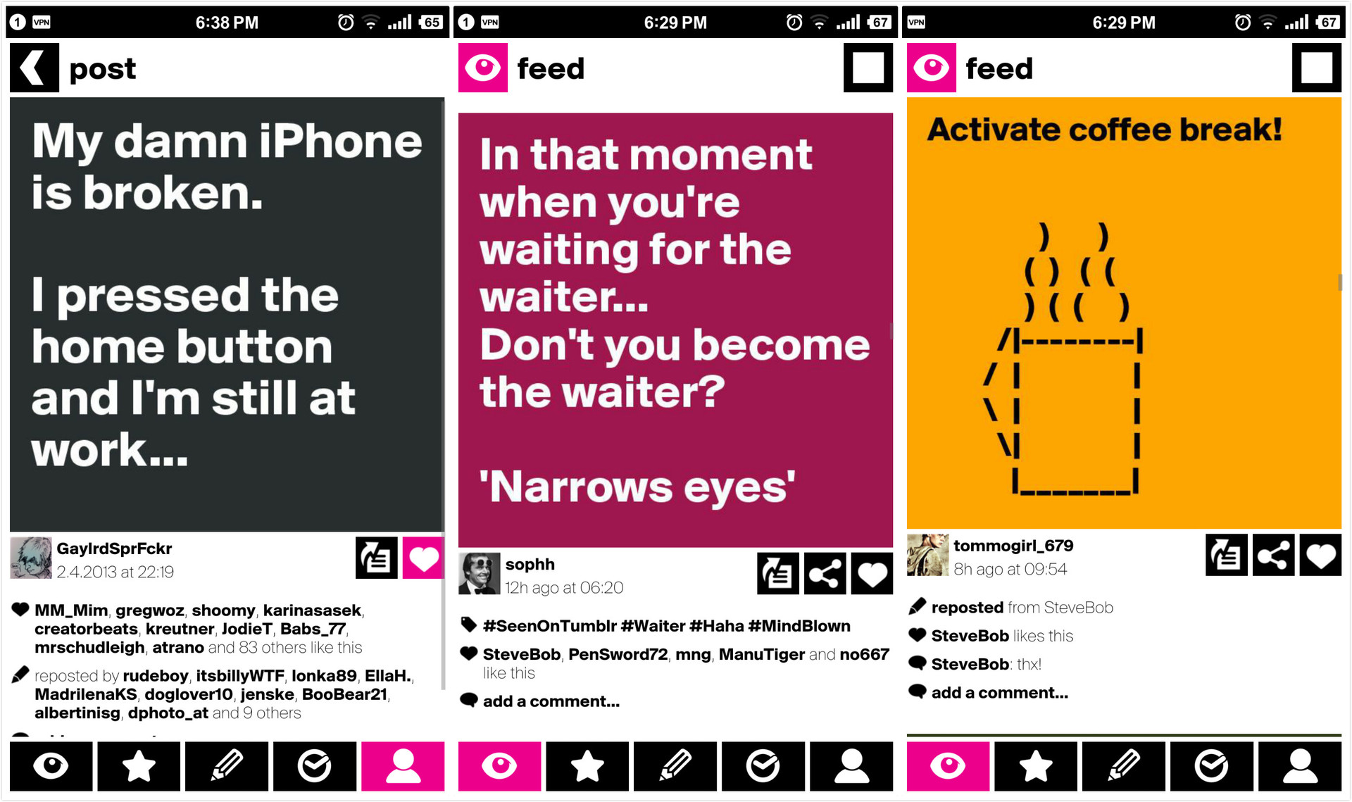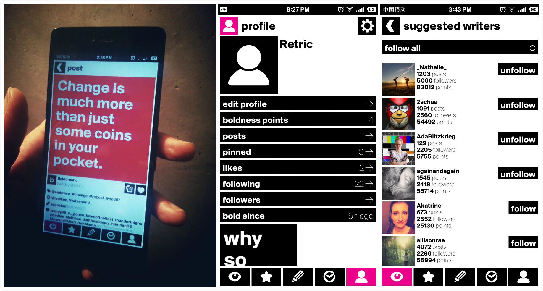 同样是碎片化阅读的Boldomatic用加粗字体和排版让文字本身变得更性感,用户更容易聚焦在内容本身。这个社区吸引着一堆热爱印刷排版、极简风格、大号字体、纯文字表达的文艺范用户,这些用户在这个只有粗体文字的世界里生产着自己独特的UGC内容,这些内容同时又是最贴近用户作为“人”思想的意识流,社交活动也因此更多的回归到了“人”身上。总的来说,这是个更纯粹一点的文字世界。