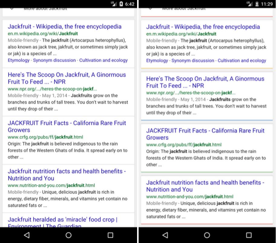 近日,Google 正在对一种新的移动搜索展示页进行测试。新的搜索结果页将单条结果间的间隔拉大,实现类似卡片的效果,并在每个卡片下方加入彩色细条。