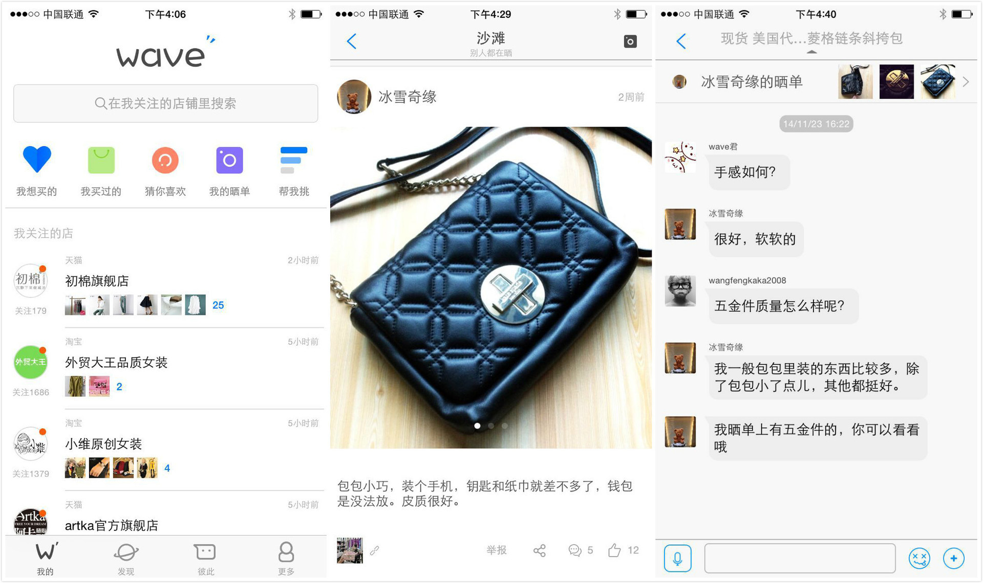 通常,在购买场景本身中,用户并没有可以沟通的地方,买东西的时候也都是通过去翻淘宝下面的评论,但是,一方面真正留言评论的用户在买了东西的用户中只占很小的比例,还有很多是“习惯性好评”,另一方面很多评论是过一定期限默认好评的。但在 wave 上,不管是店铺里陈列商品,还是其它用户晒单的商品等,都会直接导向群聊界面。原本让人聊起来是件难度系数挺大的事儿,不过,对一群要剁、想剁、已剁手的妹子而言就是另一回事儿了:聊款式、颜色、配搭、尺码、布料等,新版本的wave还导入了通讯录好友,用户可以跟好闺蜜、gay蜜边逛边聊了。