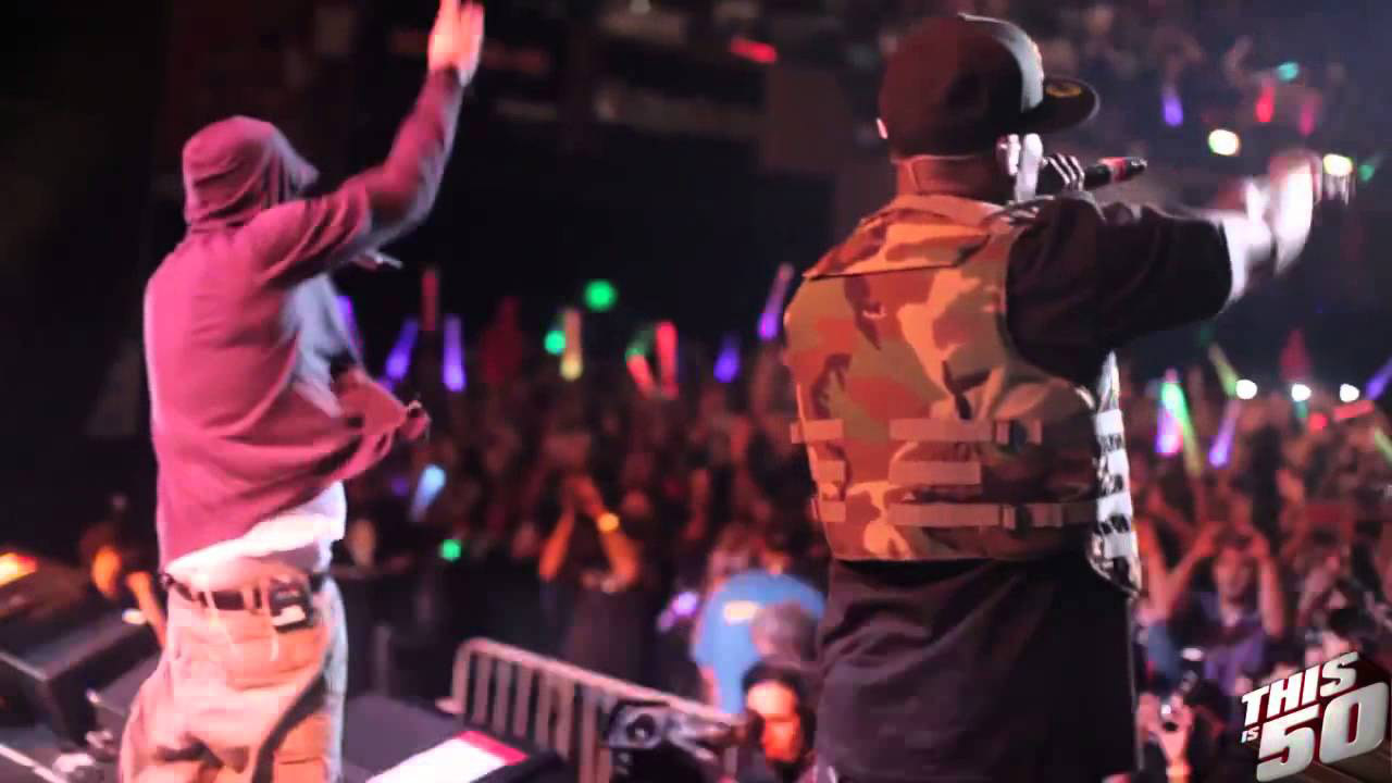 题图为 2012 SXSW 音乐节上饶舌歌手 Eminem 和 50 cent 的现场表演。