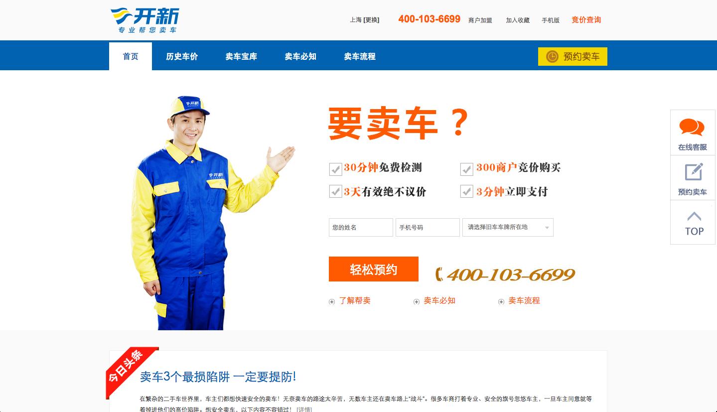 开新帮卖于2009年2月成立于上海,是一个二手车 C2B 平台,交易完成之后开新帮卖收取 4% 的佣金和过户费。开新帮卖目前已是上海比较大的线上二手车交易服务商,通过上海与深圳的15家门店提供检测与过户服务。总体来说,开新帮卖的C端车源来自于上海及其周边,辐射面积较小;其B端注册经销商买家约有1500家,范围覆盖到山东、浙江、江苏、福建、安徽等。