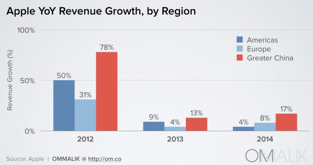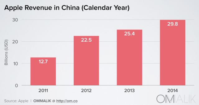 苹果的收入已经从2011年的127亿美元上升到了2014年的298亿美元。在今年2月高盛集团科技和互联网大会在旧金山举行时,曾有传闻称参会的Cook说自己研究中国已有30年了,并且他在谈及市场机遇时说"我认为我们走得还不够深入"。这对于苹果应该是个好消息,因为苹果在美国和欧洲这两个主要的市场上年收入已经开始趋于稳定,但中国市场的表现依然十分抢眼,迸发出巨大的活力。有分析预测中国市场超过欧洲也只是时间问题了。