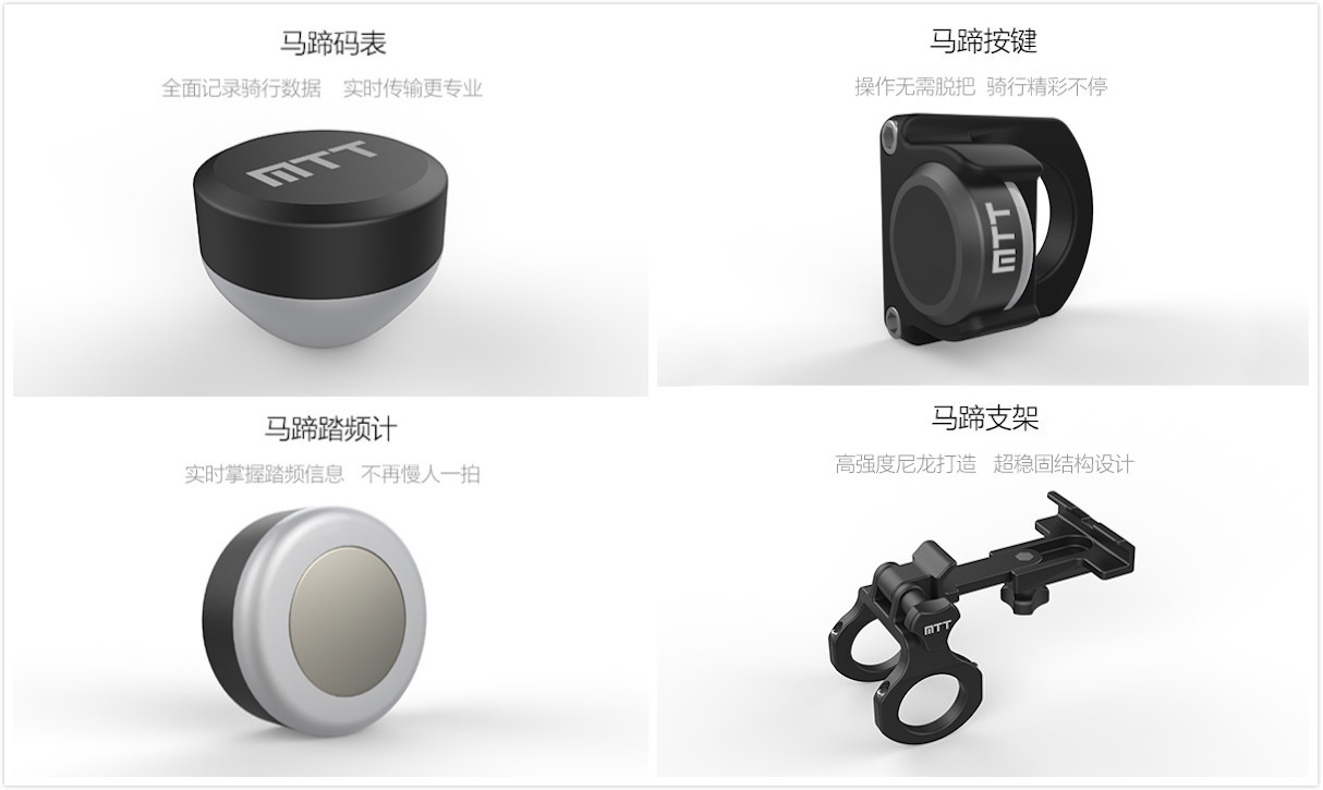 马蹄铁MTT是个四件套,包括码表、踏频计、手机支架、按键。速度、踏频是骑行爱好者最关注大数据,但传统码表等配件安装和使用都十分的复杂和繁琐,直接影响了用户体验。MTT骑行配件在通用化结构设计上下了功夫,能够便捷的适配市面上绝大部分的专业自行车。用户能在很短的时间内,完成配件系统的安装。手机端的APP也做了优化,可以快速连接按键和踏频仪,再配置各种自行车参数。