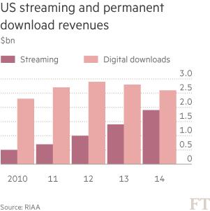 然而从数字上看,Spotify 对 iTunes 的影响应该还是挺大的。我们前几天报道过的美国唱片业协会(RIAA)所发布的美国音乐产业报告中提到,2014 年中,付费流媒体已经占了整体音乐行业收入的 27%,而以 iTunes 为代表的数字音乐付费下载模式则是 37%。RIAA 做的一个图可以看很清楚地看到流媒体音乐服务和付费下载音乐服务这几年的增长情况: