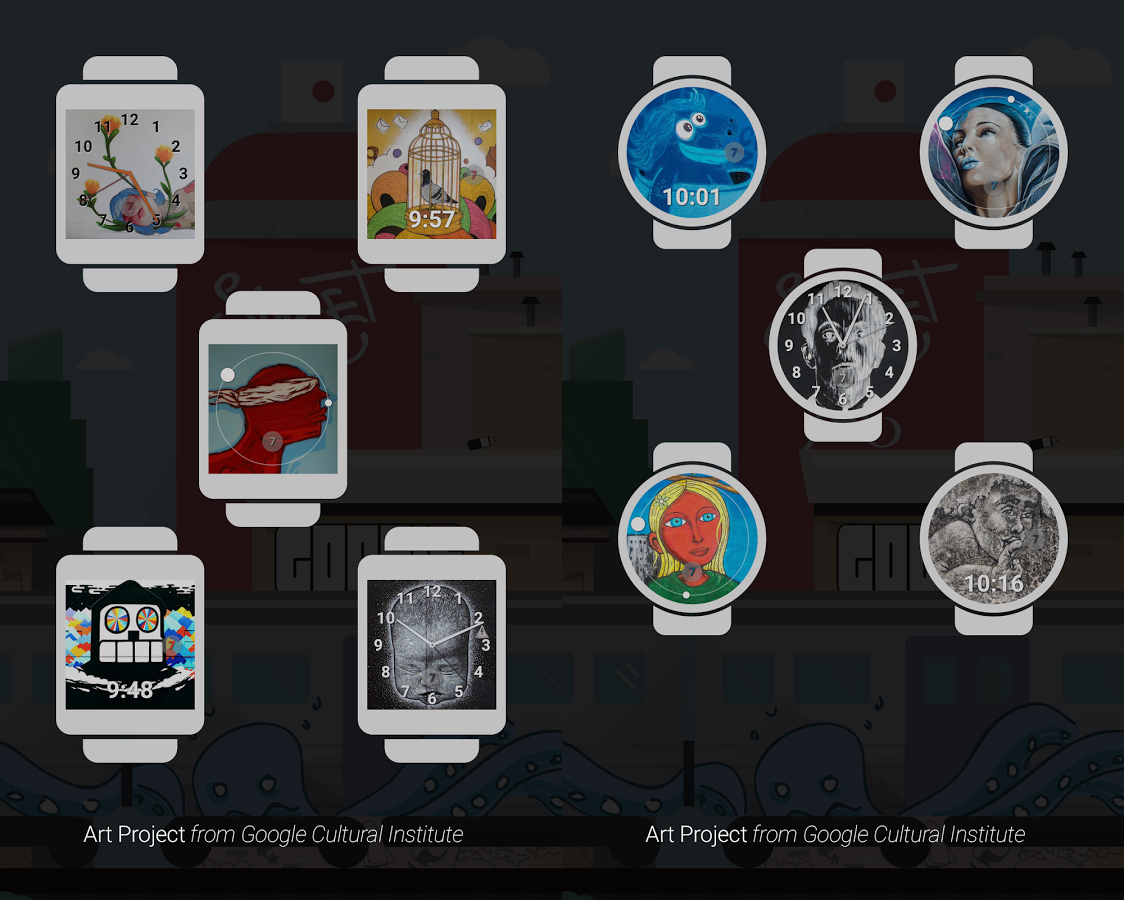 Google 把 Street Art 做成表盘搬到了 Android Wear 上,每一个艺术作品都会有不同的时间显示方式,跟以往模仿传统表盘样式的应用相比,不得不说 Google 的做法是更具艺术和创新性的。