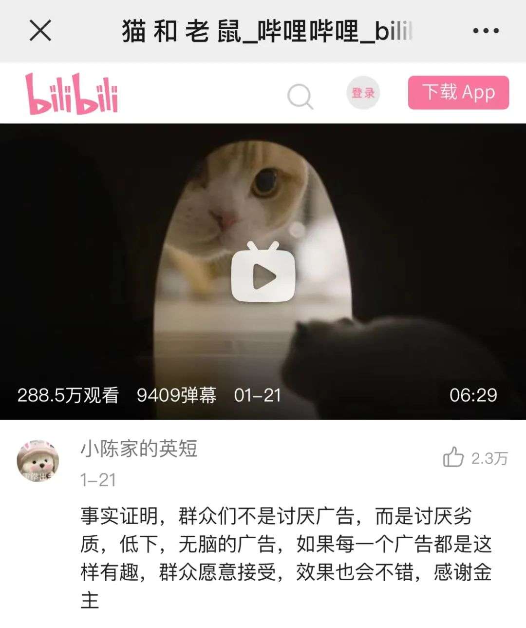 UP主“奶糕成精档案社”恰饭视频下一条获得2.3万点赞的评论代表了用户对B这种广告的接受程度。