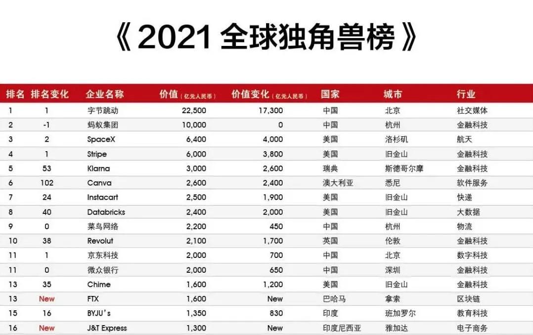 2021年年底,胡润研究院携手广州市商务局、市高新区发布了《2021年独角兽榜》,列出了中国301个价值10亿美元以上的非上市公司。