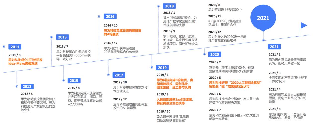 思为科技成立于2011年,是一家房地产营销SaaS服务商,聚焦营销获客-连接-洞察-运营-转化全链路,想从消费端重塑业务流程,推动行业从以“货”为中心的“信息化”,向以“人”为中心的“数字化”迈进。目前,思为面向开发商提供以数字内容工业化制作、营销流程一体化打通、客户资产沉淀及运营为核心的全场景营销解决方案,通过实现楼盘数字化、场景线上化、数据资产化、营销自动化,助力开发商打造房地产数字化营销闭环。目前,思为科技已在全球30+城市设立分公司和办事处,为500+开发商提供服务,其中百强开发商覆盖率超80%,与过半TOP20开发商达成集团性、区域性深度营销合作。