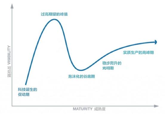 按照高德纳咨询公司所提出的技术成熟度曲线,其把新科技的成熟演变速度及要达到成熟所需的时间,分为5个阶段:技术触发期、期望膨胀期、幻觉破灭谷底期、启蒙爬升期和高原期。