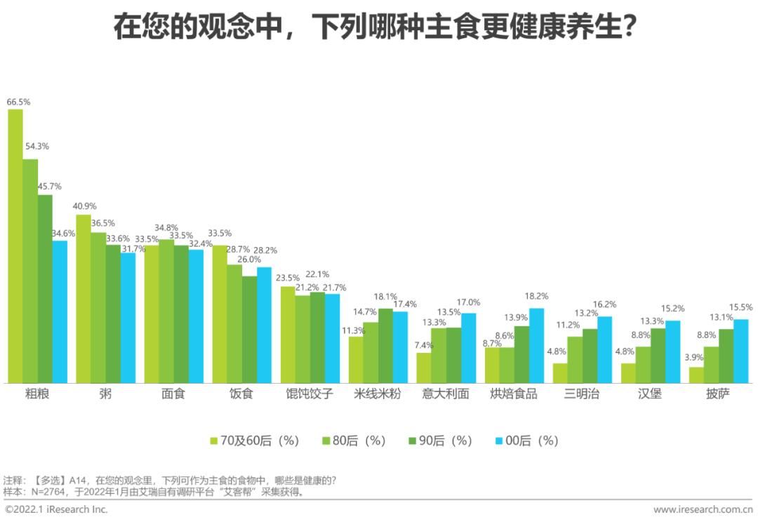 高龄代际对健康主食的认同情况非常集中,随着年龄降低,对主食的健康认同多样性逐渐增长。