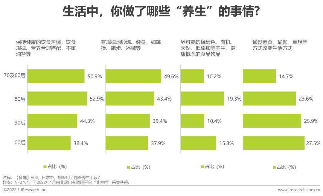 高龄代际群体更能在饮食和运动方面践行养生,而年轻代际则对更时尚的养生理念(如素食、瑜伽等)更青睐。