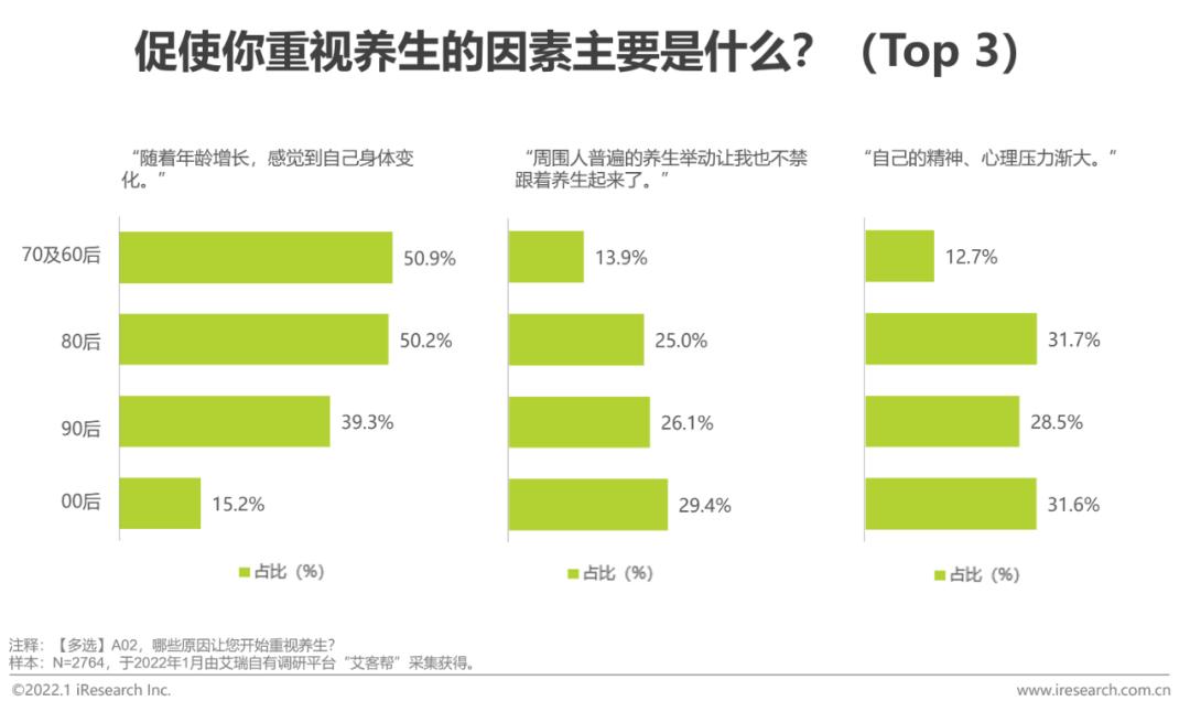 身体状况催生的养生关注随年龄显著提高,而年轻人的养生动因则更加多样,甚至不乏社交“跟风”。